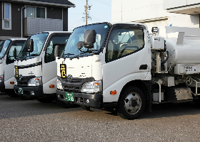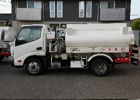 白無地のタンクローリーにて行わせて頂いており、訓練されたプロドライバーが安全且つ環境にやさしい運転で1件1件配送しております。